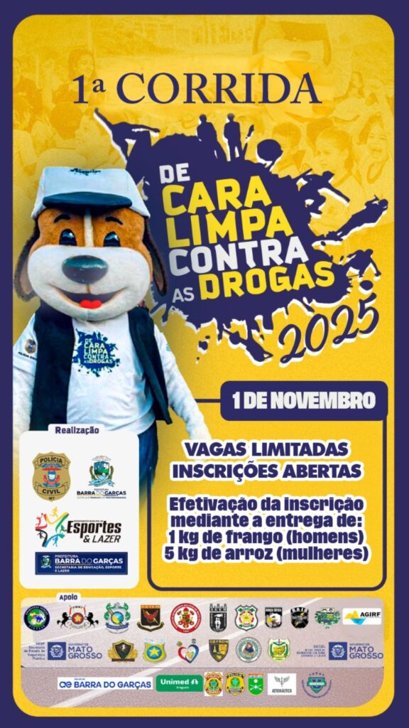 Estão abertas inscrições para 1ª Corrida De Cara Limpa Contra as Drogas, em Barra do Garças🏃🏃♀️👮♂️A corrida ocorre no dia 1º de novembro, com premiações em dinheiro para a categoria geral e por faixa etária