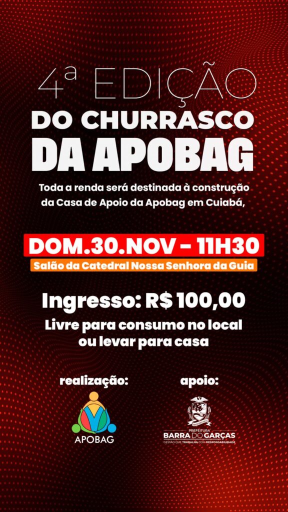 O churrasco será realizado no salão da Igreja Catedral Nossa Senhora da Guia, com início previsto para às 11h30. O valor do ingresso é de R$ 100,00, e quem optar, pode levar o churrasco para casa. Os interessados em colaborar com a causa e participar do evento podem adquirir os ingressos diretamente na sede da Apobag, que está localizada na Rua Goiás, 1050, próximo ao Batista Despachante, ou solicitar informações e realizar as compras por meio dos telefones (66) 9 9249-3535 e (66) 9 9249-6688.