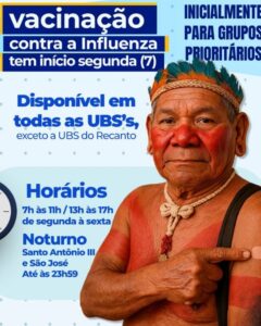 Prefeitura de Barra do Garças inicia vacinação contra a Influenza, na próxima segunda (7); Confira os grupos prioritários. As doses estarão disponíveis em todas as UBS, com exceção da UBS do Recanto das Acácias