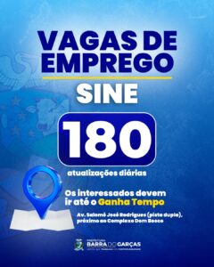 Secom-BG Nesta sexta-feira (7), o Sistema Nacional de Emprego (Sine) de Barra do Garças divulgou 180 vagas de trabalho no município, que incluem vagas para