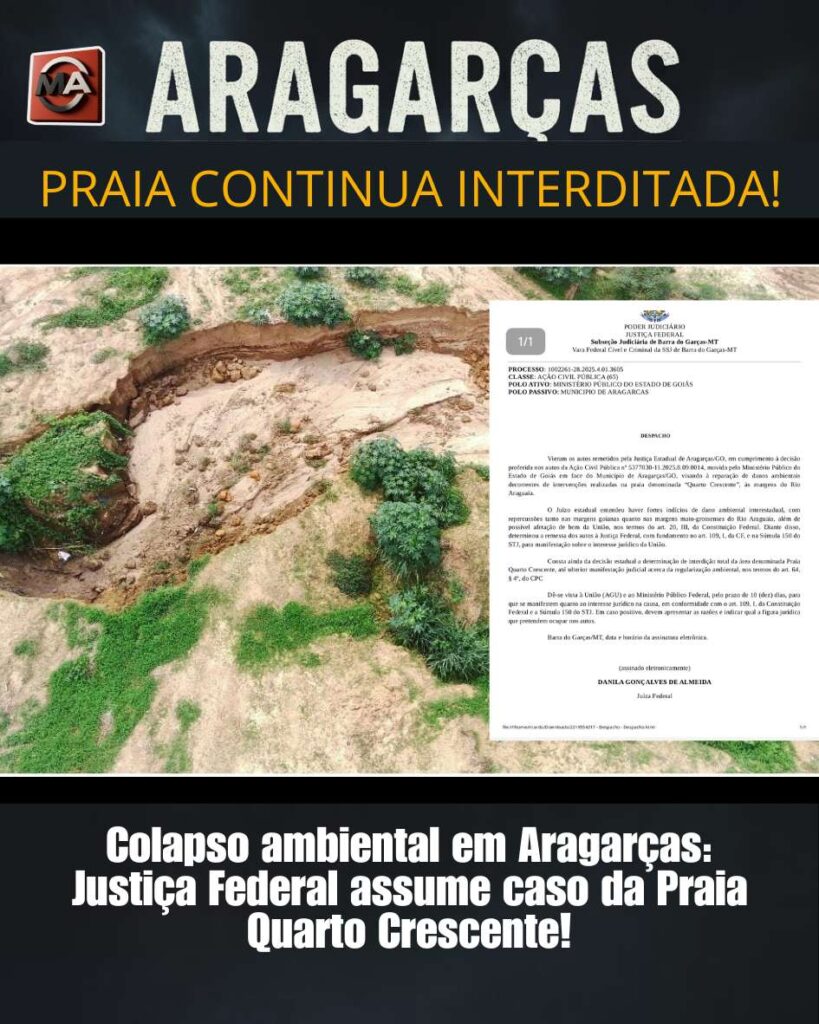 O processo que apura a degradação ambiental na Praia Quarto Crescente, localizada em Aragarças (GO), alcançou um novo patamar judicial. A ação, que teve início na comarca local, foi remetida à Justiça Federal após o descumprimento de um acordo judicial firmado para permitir a realização da temporada de praia neste ano.