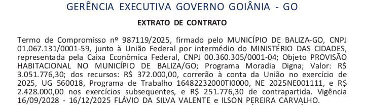 Depois de mais de doze anos de espera, o sonho da casa própria volta a ser realidade para dezenas de famílias de Baliza. No primeiro ano da gestão do prefeito Neguinho da Areia, o município conquista um avanço histórico com a formalização do Termo de Compromisso nº 987119/2025, oficialmente publicado no Diário Oficial da União (DOU), que assegura mais de R$ 3 milhões em investimentos para a provisão habitacional, por meio do Programa Moradia Digna.