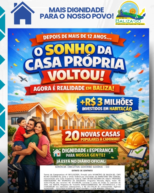 Depois de mais de doze anos de espera, o sonho da casa própria volta a ser realidade para dezenas de famílias de Baliza. No primeiro ano da gestão do prefeito Neguinho da Areia, o município conquista um avanço histórico com a formalização do Termo de Compromisso nº 987119/2025, oficialmente publicado no Diário Oficial da União (DOU), que assegura mais de R$ 3 milhões em investimentos para a provisão habitacional, por meio do Programa Moradia Digna.