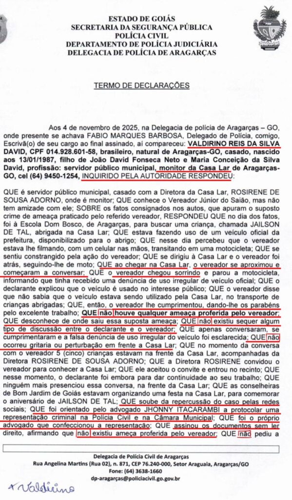 Na última terça-feira, 4 de novembro de 2025, o servidor público Valdirino Reis da Silva David, monitor da Casa Lar de Aragarças (GO), prestou depoimento à Polícia Civil, conduzido pelo delegado Fábio Marques Barbosa, no qual negou de forma categórica ter sido ameaçado pelo vereador Júnior do Saião.