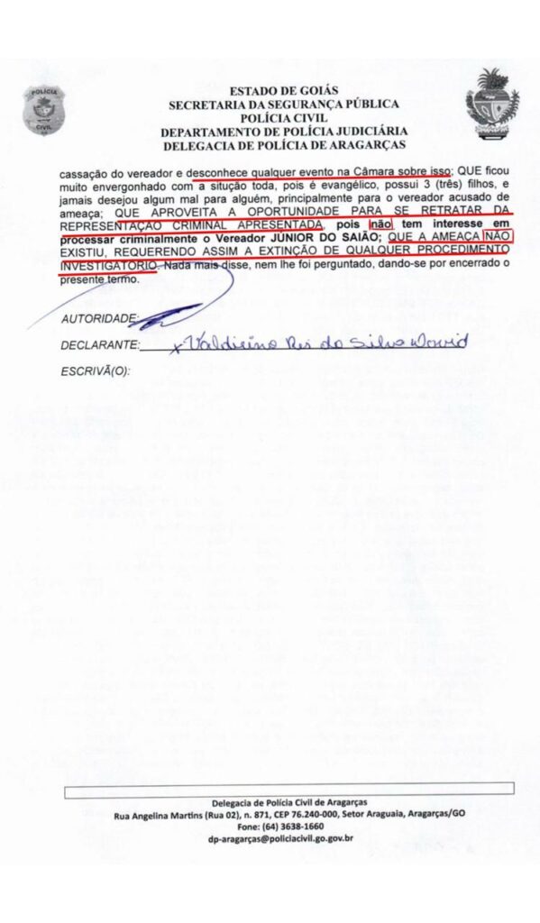 Servidor municipal de Aragarças afirma que o vereador Júnior do Saião não o ameaçou e pede a extinção de qualquer investigação sobre o caso. Delegado Fábio Marques determinou o arquivamento da denúncia.