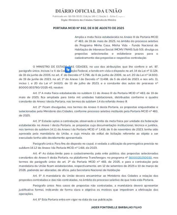 O Ministério das Cidades publicou nesta sexta-feira (8) a seleção de propostas do programa Minha Casa, Minha Vida, por meio de recursos do Fundo Nacional de Habitação de Interesse Social – modalidade MCMV-Urbano Sub50 (FNHIS).