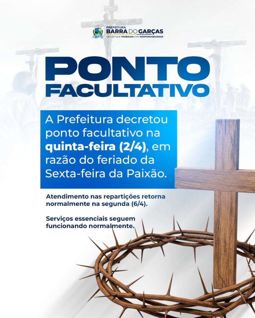 A Prefeitura de Barra do Garças publicou o Decreto nº 5.862/2026, que decreta ponto facultativo na próxima quinta-feira, 2 de abril, em razão do feriado da Sexta-feira da Paixão de Cristo, celebrado na sexta-feira, 3 de abril. O atendimento nas repartições públicas será retomado na segunda-feira, 6 de abril.