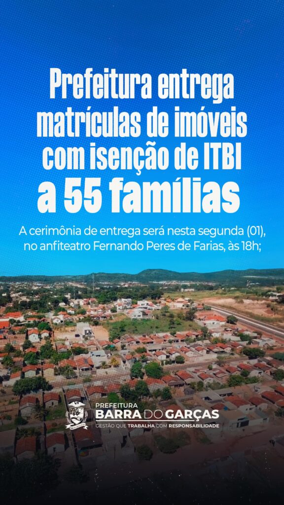 Na próxima segunda-feira (01.12), a Prefeitura de Barra do Garças, por meio da Secretaria de Planejamento e Finanças, realizará a entrega de 55 matrículas de imóveis com isenção do Imposto sobre a Transmissão de Bens Imóveis (ITBI) às famílias do Residencial Nova Barra do Garças. A cerimônia será no anfiteatro Fernando Peres de Farias, às 18h.