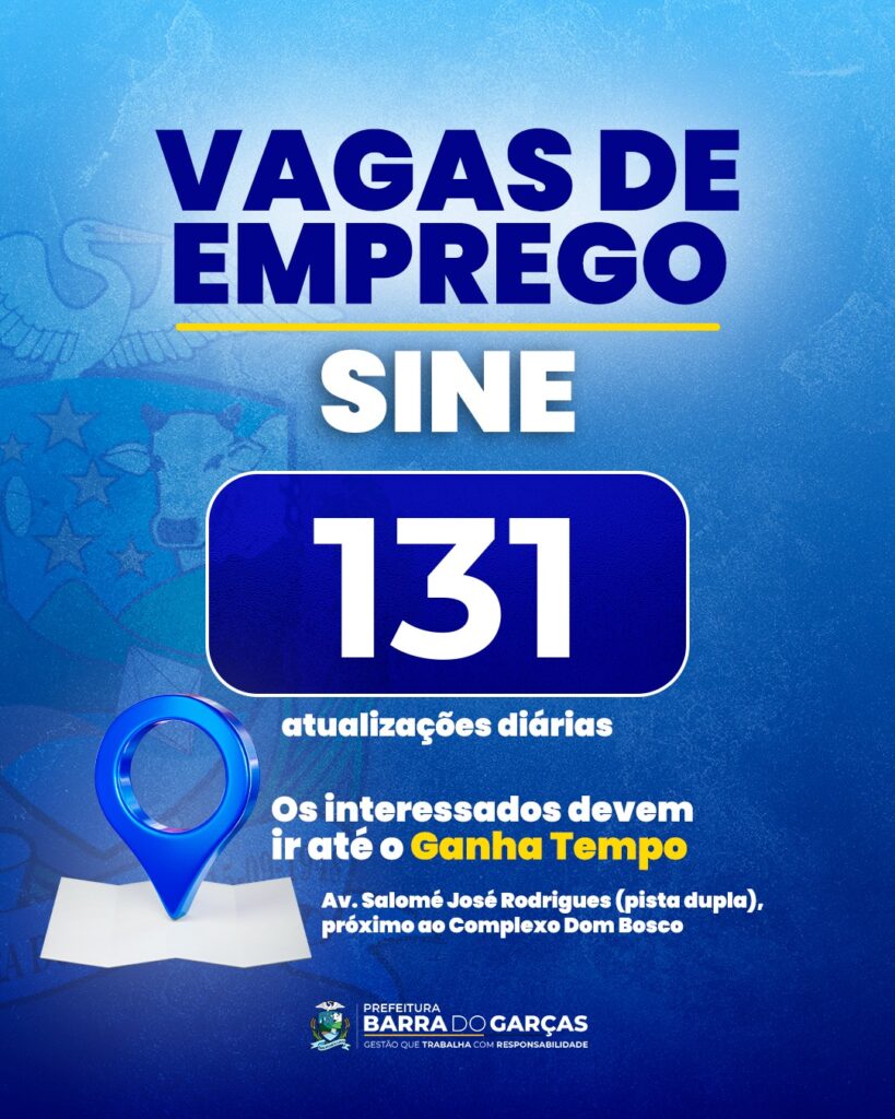 As vagas de emprego ofertadas pelo Sine são atualizadas diariamente e podem ser consultadas no site oficial da Prefeitura de Barra do Garças.